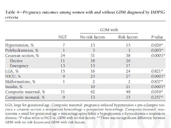 Abnormal glucose tolerance status at follow-up Glucose tolerance Previous GDM Previous NGT p value for status (n=270) (n= 388) difference IFG 12. 2% 1. 8% IGT 5. 9% 1. 5% IFG/IGT 5. 6% 0. 3% DM 2. 2% 0% Total 25. 9% 3. 6% <0. 001