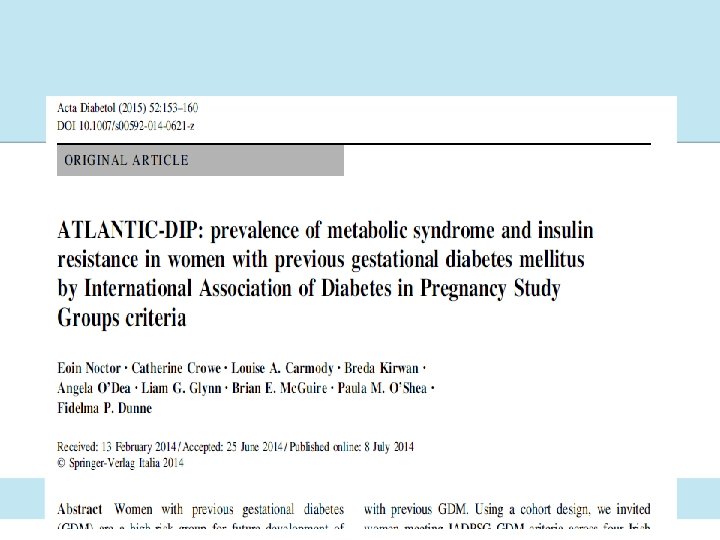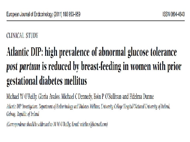 Summary • GDM is common. • Dietary intervention works. • Breast feeding should be encouraged. • Diabetes post GDM is a public health concern but can be prevented. • Metabolic syndrome and future CVS risk post GDM is a public health concern and requires F/U. • A strong screening programme is essential. • Integrated care is required. School Institute Name to go here