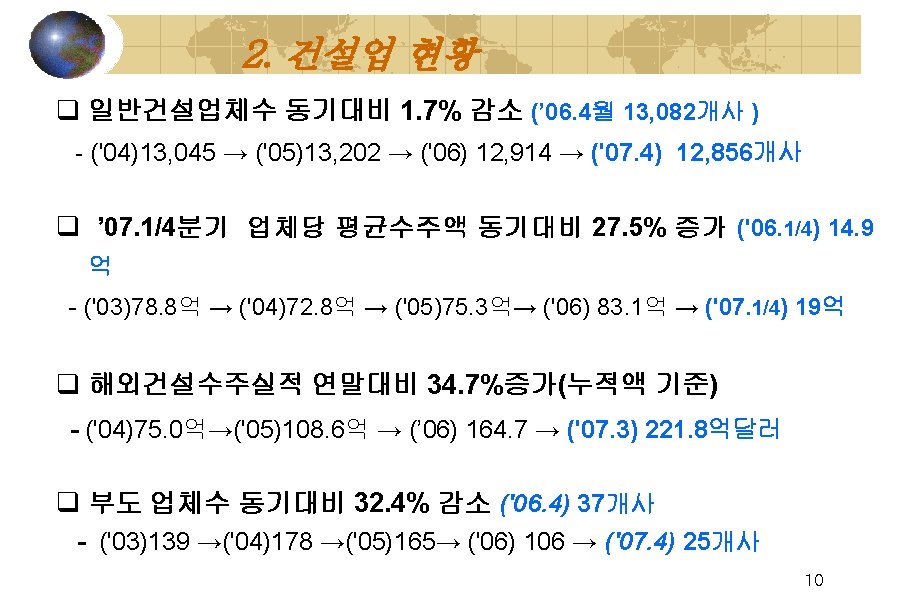 연도별 건설업고용인구 (단 위 : 천명, %) 년도 전산업 건설업 '03 22, 139 1, 816 8. 2 4, 205 19. 0 818 3. 6 '04 22, 557 1, 820 8. 1 4, 290 19. 0 860 3. 7 '05 22, 856 1, 814 7. 9 4, 234 18. 5 887 3. 7 '06 23, 151 1, 835 7. 9 4, 167 18. 0 827 3. 5 ’ 06. 1/4 23, 492 1, 726 7. 3 4, 188 17. 8 915 3. 9 ’ 07. 1/4 23, 692 1, 772 7. 5 4, 138 17. 5 851 3. 6 ’ 07. 3 23, 960 1, 850 7. 7 4, 119 17. 2 840 3. 5 비중 제조업 비중 실업자 실업률 ※자료 : 통계청 [고용동향] 9