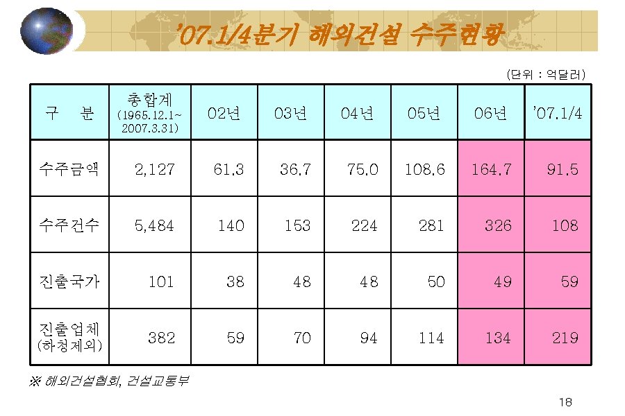 건설업의 수출기여도 (단 위 : 백만불, % ) 년도 수출실적 해외공사수주 기여도 '99 143, 686 9, 189 6. 4 '00 172, 268 5, 433 3. 2 '01 150, 439 4, 355 2. 9 '02 162, 471 6, 126 3. 8 '03 193, 817 3, 668 1. 9 '04 253, 845 7, 498 3. 0 '05 284, 419 10, 859 3. 8 '06 296, 811 16, 468 5. 5 ※ 자료 : 관세청, 해외건설협회 17