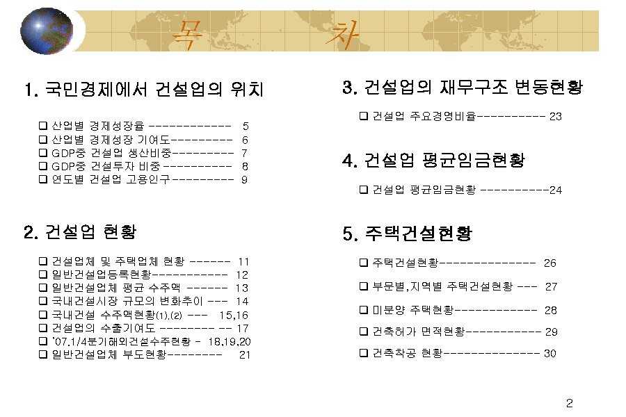 건설업체 및 주택업체 현황 (단 위 : 개사 ) 구 분 전체 년 도 일반 전문 설비 주택 '00 39, 801 7, 978 27, 364 4, 459 3, 744 '01 47, 533 11, 961 30, 573 4, 999 3, 929 '02 49, 308 12, 643 31, 388 5, 277 4, 757 '03 50, 113 12, 996 31, 840 5, 277 5, 844 '04 50, 784 13, 045 32, 401 5, 338 6, 254 '05 54, 267 13, 202 35, 560 5, 505 6, 714 ‘ 06 53, 341 12, 914 35, 040 5, 387 7, 038 ’ 07. 3 53, 704 12, 871 35, 426 5, 407 7, 015 ’ 07. 4 53, 923 12, 856 35, 665 5, 402 - ※자료 : 해당 협회 11
