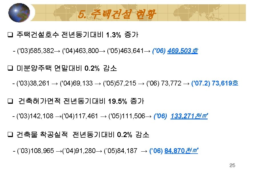 주택건설현황 (단위 : 호, %) 구분 주택건설호수 공 공 민 간 주택보급률 '99 404, 715 151, 327 253, 388 93. 3 '00 433, 488 140, 261 293, 227 96. 2 '01 529, 854 127, 927 401, 927 98. 3 '02 666, 541 123, 730 542, 811 100. 6 '03 585, 382 120, 522 464, 860 101. 2 '04 463, 800 123, 991 339, 809 102. 2 '05 463, 641 140, 978 322, 663 105. 9 ‘ 06 469, 503 143, 694 325, 809 107. 1(p) 년도 ※ 자료 : 건설교통부(주택보급률 발표: 익년 11월) 26