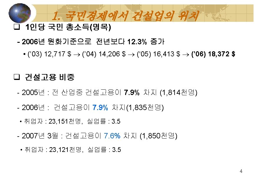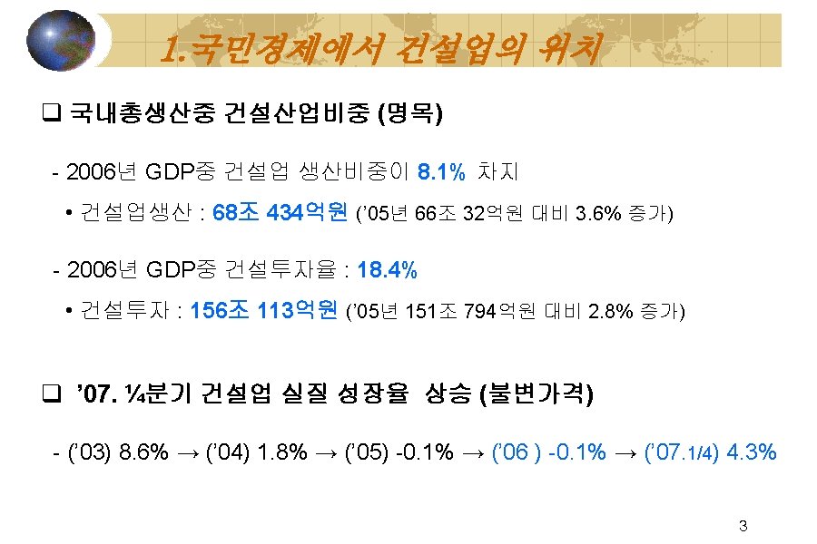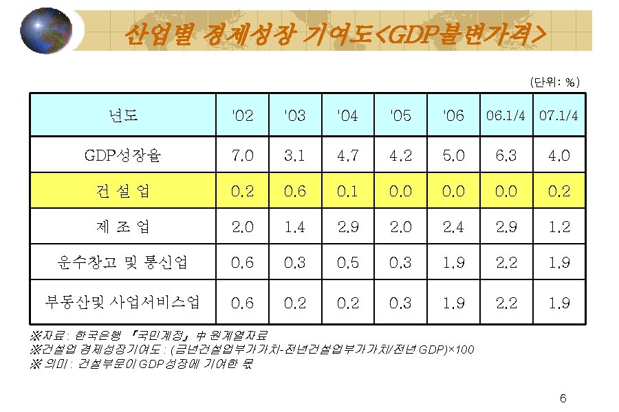GDP중 건설업 생산비중【경상가격】 (단 위 : 십억원, %) 년도 GDP 건설업 '01 622, 122. 6 47, 181. 9 7. 6 151, 766. 0 24. 4 '02 684, 263. 5 51, 541. 7 7. 5 161, 952. 0 23. 7 '03 724, 675. 0 61, 329. 8 8. 5 169, 145. 4 23. 3 '04 779, 380. 0 64, 772. 5 8. 3 198, 554. 3 25. 5 '05 806, 621. 9 66, 375. 0 8. 2 204, 239. 2 25. 3 ‘ 06 847, 876. 4 68, 434. 3 8. 1 209, 835. 4 24. 7 비중 제조업 비중 ※자료 : 한국은행 국민계정」 ※의미 : 생산면에서 본 산업별 부가가치액(최종생산물) 7