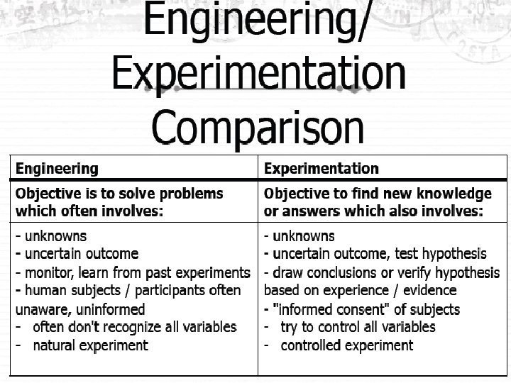 Contrasts: The scientific experiments in the laboratory and the engineering experiments in the filed exhibit several Contrasts: Experimental control: In standard experiments, members for study are selected into two groups namely A and B at random. Group A are given special treatment. The group B is given no treatment and is called the ‘controlled group’. But they are placed in the same environment as the other group A. This practice is adopted in the field of medicine. In engineering, this does not happen, except when the project is confined to laboratory experiments. Humane touch: Engineering experiments involve human souls, their needs, views, expectations, and creative use as in case of social experimentation. This point of view is not agreed by many of the engineers. But now the quality engineers and managers have fully realized this humane aspect. Informed consent: Knowledge gained: