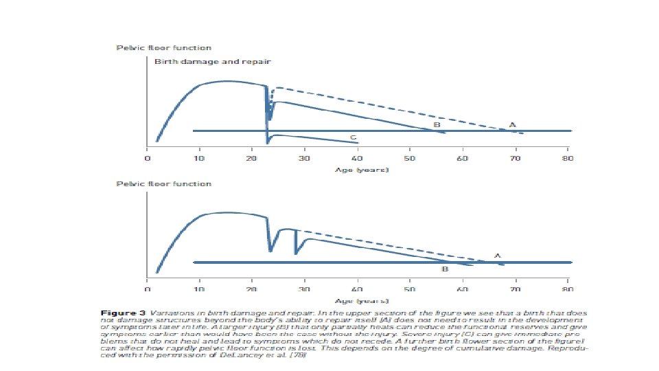 Gebelik Uygun anamnez alma Perine USG (istirahatte ve ıkınma esnasında) Mesane boynu mobilitesinin değerlendirilmesi Mesane boynunun doğru inmesi gebeliğin ortasında Fasyanın mekanik özellikleri ile Pelvik taban aşağıya kontraktilitesinin Artmış mesane boynu mobilitesi uyumlu olarak değerlendirilmesi Artmış POP gebelikteki mekanik ve hormonal Azalmış üretra direnci Pelvik taban kontraktilitesinin kaybı değişimlere karşı adaptasyondur. Önleyici yöntemler İlk vajinal doğum kadınların çoğunun pelvik taban hasarına maruz kaldığı zamandır (Pelvik Nörojenik hasar taban kas eğitimi, wo pesser, hayat değişiklikleri – kilo, sigara) Mesane boynu pozisyonu ve mobilitesinin değişmesi LA travması Levator hiatusta artma Anal sifinkter hasarı Kadınların çoğunda pelvik taban kas fonksiyonları postpartum 1. yılda düzelir Az bir kısmında semptomlar persiste olabilir ve daha sonraki yıllarda PTD görülebilir.