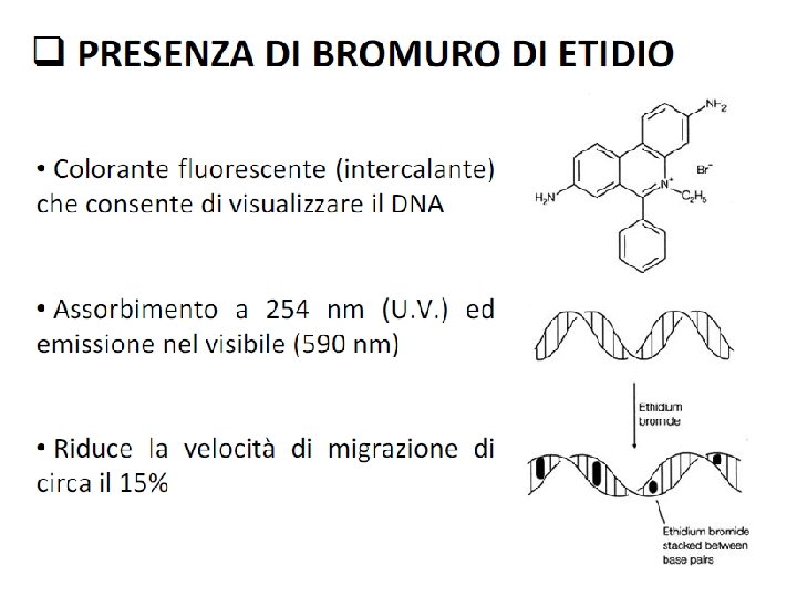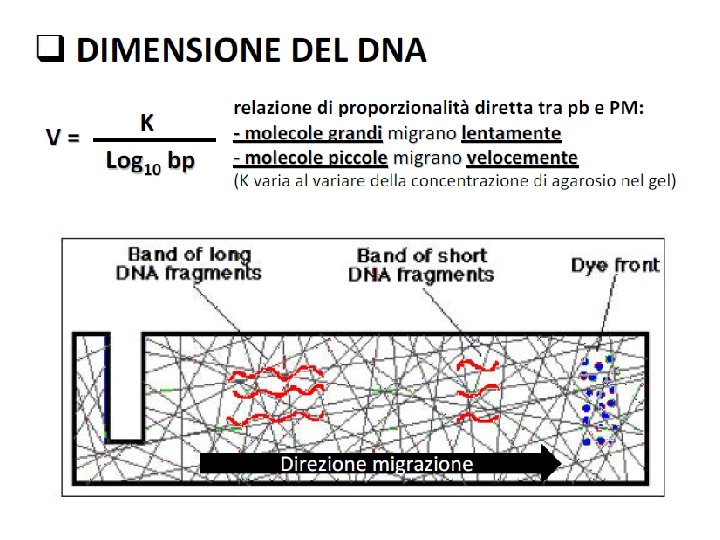 Fattori che influenzano la velocità di migrazione del DNA sul gel Dimensione della molecola di DNA La velocità di migrazione è inversamente proporzionale al lg 10 bp Concentrazione dell’agarosio Esiste una relazione lineare tra la concentrazione del gel ( ) e logaritmo della mobilità elettroforetica ( ) log = log °-Kr ° = mobilità elettroforetica libera Kr = coefficiente di ritardo (dipende dalle proprietà del gel e dalle dimensioni e forma delle molecole) Usando gel di conc. differenti è possibile separare una vasta gamma di molecole di DNA Conc. di agarosio Range di separazione (%) (Kb) 0. 3 5 -60 0. 9 0. 5 -7 1. 2 0. 4 -6 1. 5 0. 2 -3 2. 0 0. 1 -2