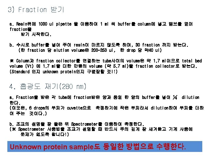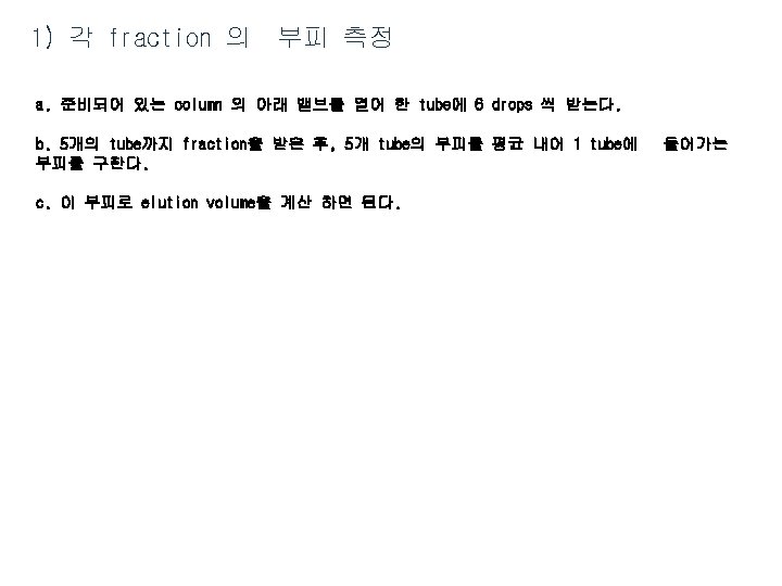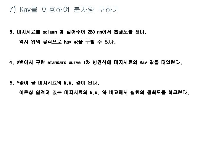 7) Kav를 이용하여 분자량 구하기 1. Standard solution (Blue dextran, Conalbumin, Ribonuclease A, Aprotinin)을 먼저 column에 걸어준다. 280 nm에서 흡광도를 측정한 뒤 그래프를 그린다. Standard sample size Standard sample elution 순서 blue dextran (2000 k. Da) Conalbumin (75 k. Da) 1. Blue dextran Ribonuclease A (13. 7 k. Da) Aprotinin (6. 5 k. Da) 3. Ribonuclease A 2. Conalbumin 4. Aprotinin Ve의 결정: graph에서 peak을 이루는 fraction의 elution volume을 Ve로 정한다.