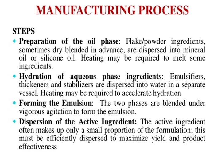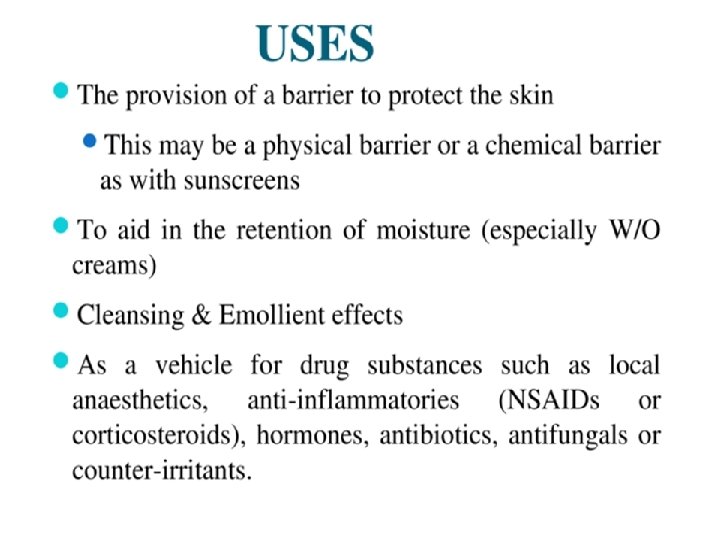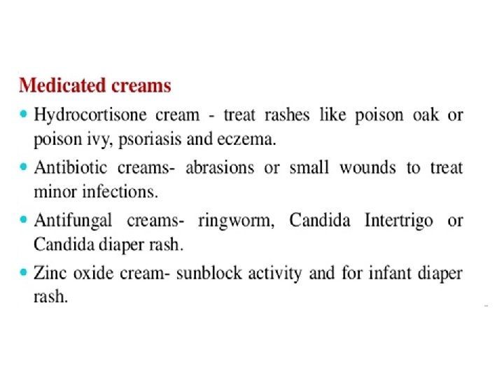 Vanishing cream • an o/w emulsion that contains a large percentage of water as well as a humectants (e. g. , sorbitol, glycerin, or propylene glycol) that retards surface evaporation of water. • These are produced by synthetic waxes, e. g. macrogol and cetomacrogol • They are useful as water-washable bases • Examples : Shaving creams , Hand creams , Foundation creams • Upon rubbing this cream on the skin, the external/continuous aqueous phase evaporates, leading to increased concentration of a water-soluble drug in the oily film that adheres to the skin. This increase in the concentration gradient of the drug across the stratum corneum promotes percutaneous absorption