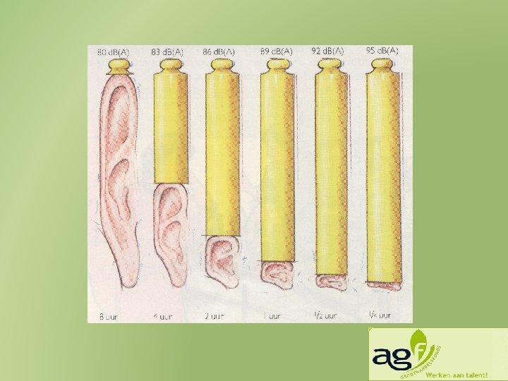Maximale blootstellingsduur Met iedere 3 d. B erbij verdubbelt de hoeveelheid geluidsenergie, zodat de veilige blootstellingsduur halveert. • • • 80 decibel 83 decibel 86 decibel 89 decibel 92 decibel 95 decibel 8 uur per dag 4 uur per dag 2 uur per dag 1/2 uur per dag 1/4 uur per dag Een verschil van 3 d. B(A) is nauwelijks te horen!!