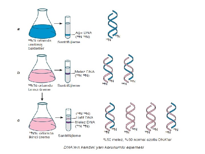 N 14 lu ortam Ağır DNA N 15 Melez DNA N 14 N 15 N 14 Normal DNA N 14 N 15 Melez DNA N 14 Normal DNA N 15 N 14 Melez DNA