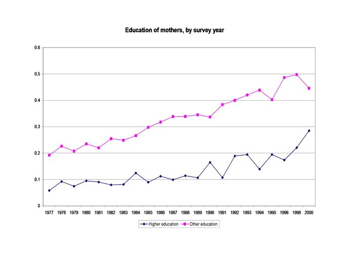 Higher education of mothers • Effect through income – higher income, more education • Effect on home investment –quantity/quality • Tastes/attitude to education of children Most research suggests that mother’s education is more influential than father’s; and has a bigger influence on girl’s education