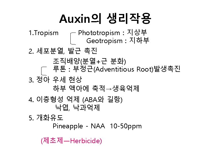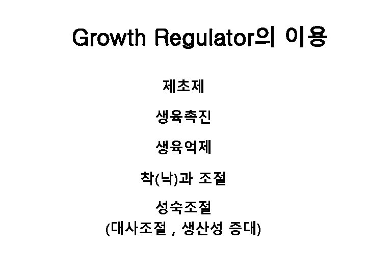 생장Hormone (Plant Hormone) An organic compound synthesized at one plant part and translocated to anther part, where in very low concentrations it causes significant physiological response. Auxin, Gibberellin, Cytokinin ABA(Abscisic Acid), Ethylene 생장조절물질 (Plant Growth Regulator) Physiologically active compound, including Growth Hormones Synthetic Compounds.