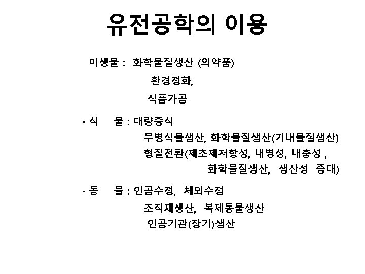 Gene expression DNA ® m. RNA ® Protein(효소) ® 생리현상 Recombinant DNA Gene Isolation (A) Tumer Inducing (A) Plasmids + DNA (cell) Recombinan t DNA (A) (cell) Organism (A)