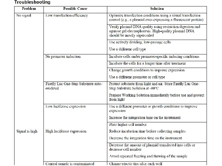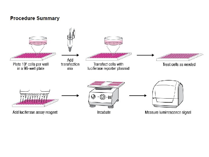 REPORTER GENES GENE ADVANTAGES DISADVANTAGES Bacteria BGalattosidasi () Very wellcharacterized, stable easy to detect Endogenous activity in the cell Luciferase (firefly) High specific activity, no endogenous activity (very low background) Requires the addition of cofactor, O 2, ATP. Akcalyn phosphatase (human) This protein is secreted. The assay is very sensitive. High endogenous activity in some cell types. fluorescent proteins (GFP, varianti RFP, BFP) monomeric, no cofactors required, absent from mammalian cells, different variants with different fluorescence l low sensitivity because there is no amplification (it is not an enzymatic reaction)