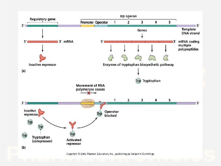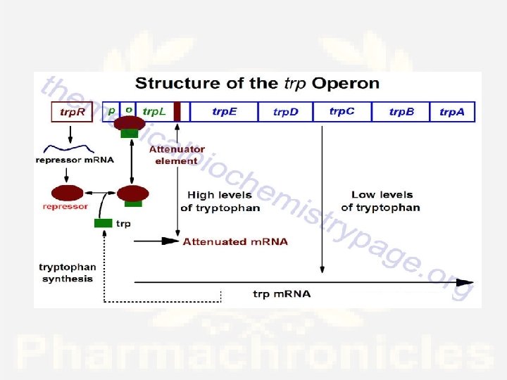 Ø Binding of repressor to trp operator shuts off synthesis Ø When there is not enough tryptophan, the Apo repressor adopt three dimensional conformation unable to bind with trp operator and the operon is transcribed Ø When tryptophan is present at high concentration, it binds to aporepressor and forms and cause it to change conformation into active repressor. It binds to the operator and prevent transcription
