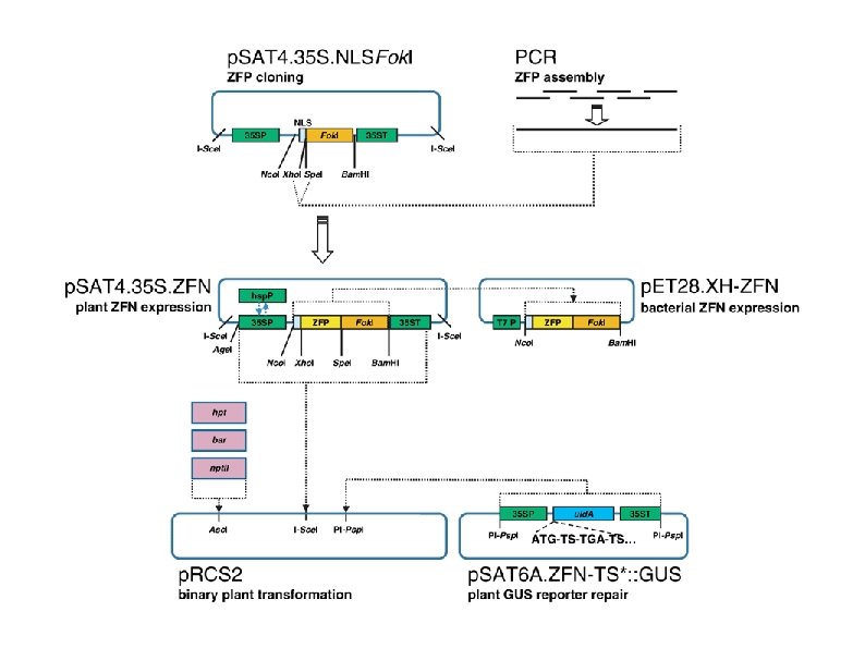 ● Structural features of the zinc finger nuclease (ZFN) assembly and expression vector systems. A zinc finger protein (ZFP) coding sequence can be assembled by Klenow/PCR using a combination of overlapping backbone and sequence-dependent oligonucleotides fused to the Fok. I endonuclease domain in p. SAT 4. 35 SP. NLSFok. I, producing the plant expression vector p. SAT 4. 35 SP. ZFN. The entire ZFN coding sequence can be transferred onto a p. ET 28. XH-based vector producing a p. ET 28. XH-ZFN vector, suitable for ZFN expression in bacterial cells and for in vivo digestion assays. The p. SAT 4. 35 SP. ZFN can be modified by replacing the 35 S constitutive promoter with a heat-shock-inducible promoter, producing a plasmid that is useful for the whole-plant DNA repair assay. A plant-selectable marker, a ZFN and a mutated GUS reporter expression cassette can be mounted onto a p. RCS 2 -based binary plant transformation vector using a combination of rare-cutting restriction enzymes and can then be used for various in planta assays. 35 SP, 35 S promoter; 35 ST, 35 S terminator; hsp, heat shock promoter.