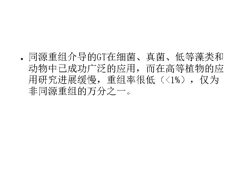 Two approaches for GT: 1. Homologous recombination-dependent gene targeting, e. g. tobacco(ALS乙酰乳酸合成酶 ) , Arbidopsis(PPO, protoporphyrinogen oxidase原卟啉原氧化酶 ) and rice(Waxy); 2. Chimeric RNA/DNA oligonucleotide-directed targeted point mutations, e. g. AHAS(乙酰羟酸合成酶) in maize and ALS in tobacco and rice.