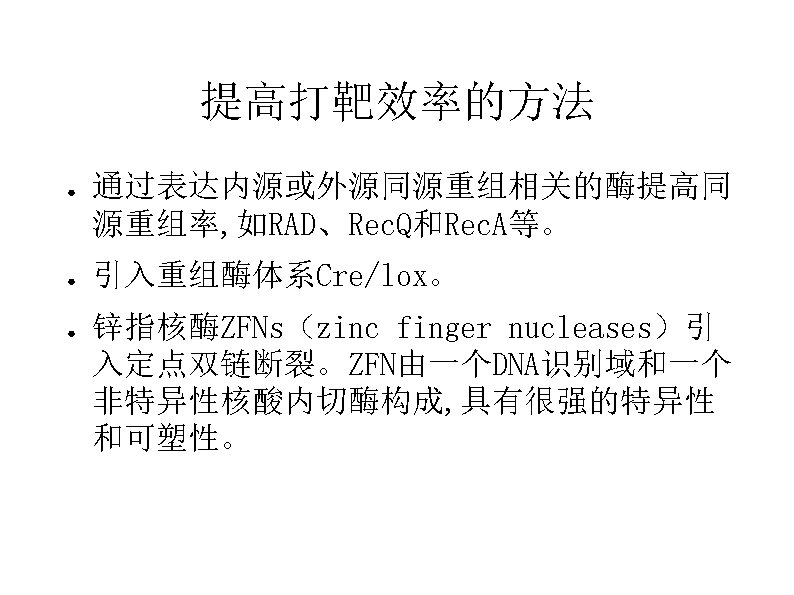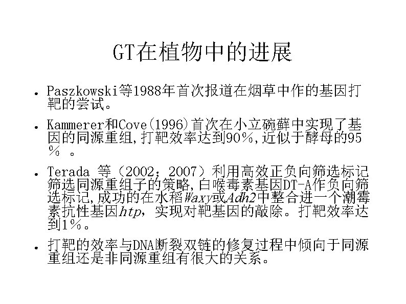 Two approaches for GT: 1. Homologous recombination-dependent gene targeting, e. g. tobacco(ALS乙酰乳酸合成酶 ) , Arbidopsis(PPO, protoporphyrinogen oxidase原卟啉原氧化酶 ) and rice(Waxy); 2. Chimeric RNA/DNA oligonucleotide-directed targeted point mutations, e. g. AHAS(乙酰羟酸合成酶) in maize and ALS in tobacco and rice.