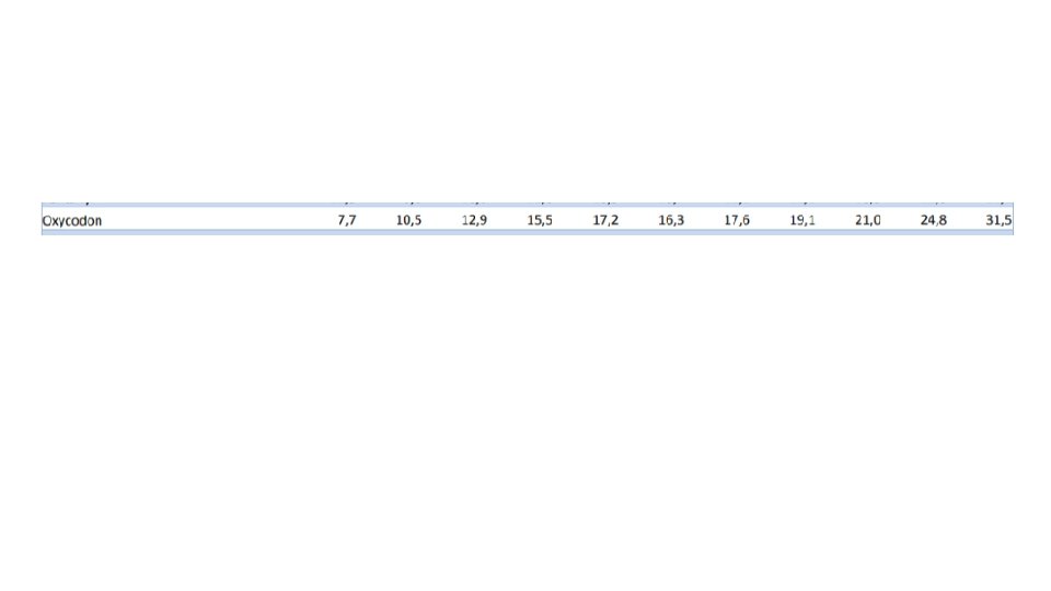 Waarom stijgt het aantal recepten? 65% van alle eerste opiaat recepten voorgeschreven in de 2 e lijn Patiënt verlaten het ziekenhuis sneller In kwaliteitsbeoordeling ziekenhuizen zit ook de pijnscore die patiënten zelf aangeven: Een meisje van 16 jaar krijgt na haar tonsillectomie – volgens protocol van het ziekenhuis – een receptje mee voor 63 oxycodontabletten. Een hoogbejaarde man met een oude inzakkingsfractuur van een wervel krijgt een korset en oxycodon.