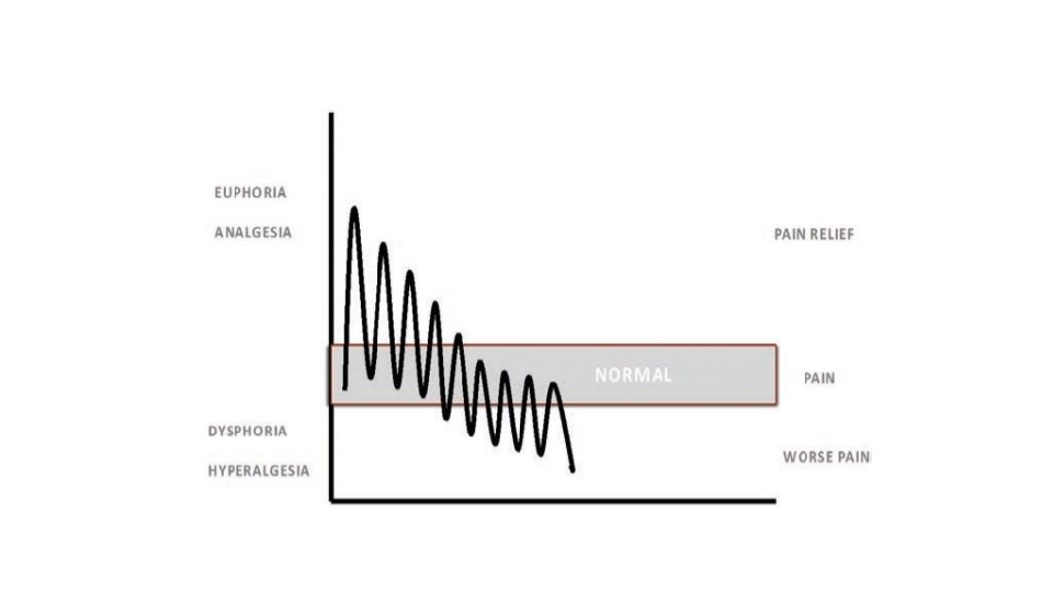Nadelen van chronisch gebruik ●Geassocieerde risico’s: ○ Hypogonadisme ○ Immuunsuppressie ○ Myocardinfarct ●Bijwerkingen: ○ Obstipatie (geen tolerantie!) ○ Anhedonie, somberheid ●Paradoxaal: hyperalgesie/toename pijnklachten ●Ontwenningsverschijnselen (let op: tolerantie!): ○ Irritatie, onrust, tremor ○ Pijn ○ Misselijkheid/braken, diarree, tranen
