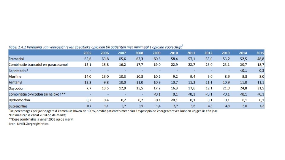 Inhoud ● Epidemiologie/statistieken ● Hoe is het zover gekomen ● In groepjes: Hoe gaat het in de praktijk? ● Werking opiaten ● Chronisch gebruik en verslaving ● In groepjes: Hoe pak je dit aan? ● Afbouwen/verwijzen