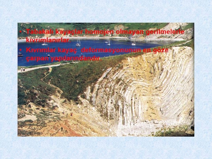 ÇATLAKLAR VE FAYLAR Herhangi bir kayaca etkiyen kuvvetlerin kayacı oluşturan parçaları birbirinden ayırması veya parçalaması şeklinde meydana gelen olaya “kırılma” adı verilir. Kırılma yüzeyi arasındaki açıklık bir santimetreden daha küçük ise “çatlak” bir santimetreden daha fazla olması durumunda ise “yarık” olarak tanımlanır. Kırık yüzeylerinin birbirlerine kıyasla gözle görülebilir bir şekilde kaymaları sonucunda ise “fay” denilen kırıklı yapılar oluşmaktadır.