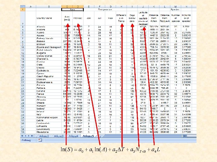 The final model Negative species density Realistic increase of species richness with area Increase of species richness with winter length Increase of species richness at higher latitudes A peak of species richness at intermediate latitudes Is this model realistic? The model makes a series of unrealistic predictions. Our initial assumptions are wrong despite of the high degree of variance explanation Our problem arises in part from the intercorrelation between the predictor variables (multicollinearity). We solve the problem by a stepwise approach eliminating the variables that are either not significant or give unreasonable parameter values The variance explanation of this final model is higher than that of the previous one.