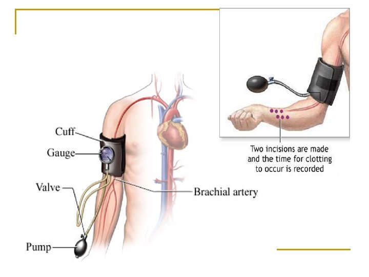 Ivy Method q In the Ivy method, a blood pressure cuff is placed on the upper arm and inflated to 40 mm. Hg to control capillary tone and to improve the sensitivity and reproducibility– this will maintain constant pressure within the capillaries and help standardize the procedure-. q A sterile, disposable blood lancet is used to make a shallow incision that is 1 millimeter deep on the underside of the forearm. q Every 30 seconds, filter paper is used to draw off the blood. q The time from when the incision is made until all bleeding has stopped is measured.