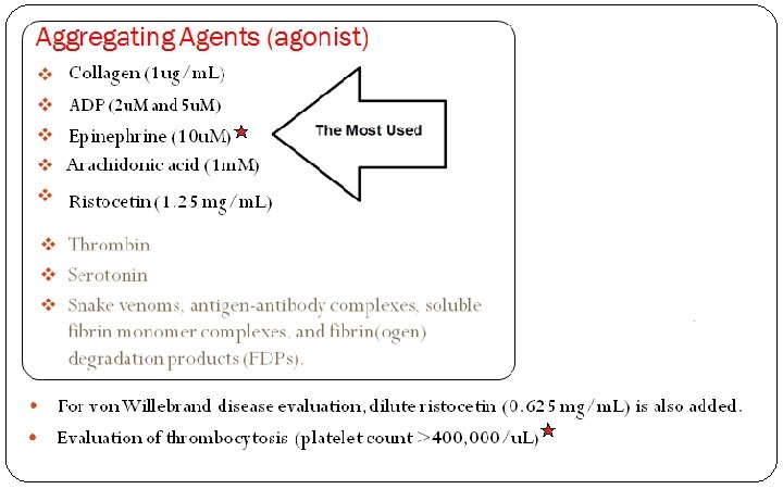 q In addition, different concentrations of the same agonist can produce varying patterns of primary and secondary aggregation. For example, Low concentrations of ADP induce biphasic aggregation (i. e. , both a primary and a secondary wave of aggregation); q Very low concentrations of ADP (l. 5 ug/ml. final concentration) induce a primary wave followed by disaggregation; q And high concentrations of ADP (10 ug/ml, final concentration) induce a single, broad wave of aggregation“ q q q A biphasic aggregation response to ADP will not be seen in patients with platelet release disorders. Patients with Glanzrnann's thrombasthenia show incomplete aggregation with ADP regardless of the final concentration.