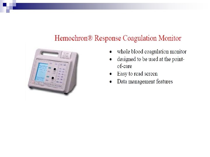 Hemochron® n Tests measured ¨ Heparin monitoring with or without Aprotinin. n Sample and volume requirements ¨ Fresh whole blood- 2 m. L. Elite: 200µL to fill cuvette well. n Controls ¨ Electronic QC ¨ Liquid quality control- normal and abnormal n Reference Ranges ¨ Normal range- healthy donors n RFTCA 510 tubes: 105 – 167 seconds n FTK-ACT tubes: 91 – 151 seconds ¨ Normal range- cardiopulmonary bypass patients n HRFTCA 510 tubes: 86 - 147 seconds n FTK-ACT tubes: 89 - 153 seconds