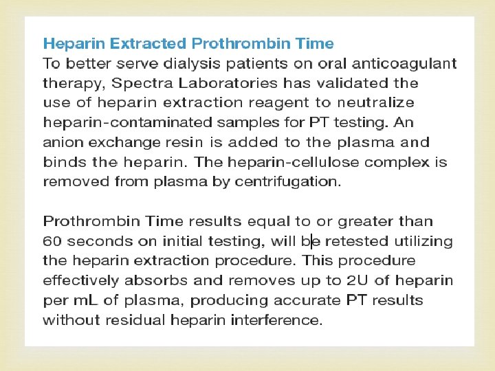 Interfering Factors r r r Diet: ingestion of excessive green, leafy vegetables will increase the absorption of vit-K, which promotes blood clots. Alcoholism, Prolonged PT levels Diarrhea and vomiting decrease PT because of dehydration. Quality of Vein puncture. Medication : Antibiotics , Aspirin, Cimethidine…. Prolonged Storage of plasma at 4 o C.