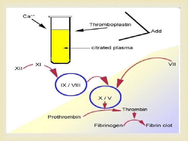 Procedure q q Reconstitute tissue thromboplastin according to instructions. Label the thromboplastin with the time, date and initials. The thromboplastin reagent is stabile for 7 days after reconstitution. Allow to sit 10 -15 minutes, then invert gently several times. Mix well prior to pipetting any of this reagent at any step in this procedure. Prewarming of the reagent by pipetting 1 -2 mls, using a plastic pipette, of the tissue PT reagent into a glass test tube and place in a 370 C water bath incubator.