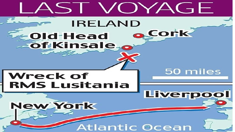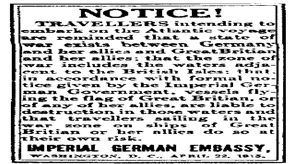 Lusitania • German U-Boat sank British Luxury Liner off coast of Ireland (carrying 4, 200 cases of ammunition) • Unknown to her passengers but no secret to the Germans, almost all her hidden cargo consisted of munitions for war effort. • 1, 198 killed (94 children & 35 infants) 128 Americans • Moral Wilson objected calling it barbaric act • Germany defense: • 1. carrying munitions • 2. warnings in U. S. papers • 3. U-Boat rendered useless if follow rules of warfare • 4. Lusitania sister ship carried troops • 5. 750, 000 Germans are starving to death