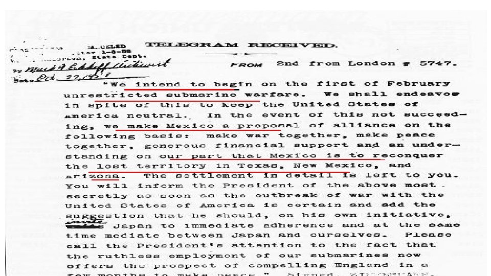 Zimmermann Note • March 1, 1917 (Wilson had sent in forces into Mexico-ABC Affair) • German Foreign sec. sent a telegram to German ambassador in Mexico. Ex. Sec of State sending message to German ambassador to Mexico • Tried to get alliance between Mexico & Germany (when Germany committed to cont. unrestricted submarine warfare after Sussex pledge failed) • promise Mexico help in recovering lost lands in Mexican War (TX, NM, AZ) (Mexican War 1846 -48 0 nly 69 yrs ago) • Germans strategy: Using strained relations w/ Mexico against us. • Strategy: if Mexico declares war on U. S. , we will be too busy at home to fight in Europe (can’t turn the tide of the stalemate if fighting in SW U. S. ) Is this a smart stagey & why or why not? • The telegram was caught by the British before it could get to Mexico (British trying to sway U. S. opinion) Western part of country upset now & want war (now U. S. unified in wanting war) • On another note: 1915 German spy left briefcase on subway detailing plans for industrial sabotage –fueled fire for War too