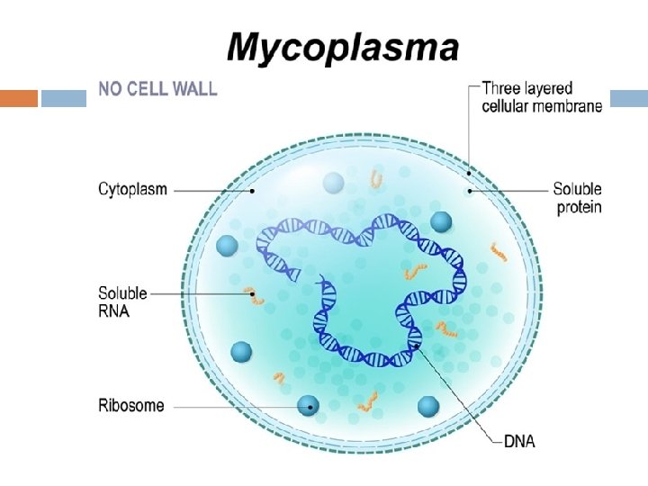 Bacteria Nucleoid or incipient nucleus is composed of naked DNA, RNA and non-histone proteins. DNA is circular and double stranded. Cell wall is made up of peptidoglycan (amino acids+sugar) except in archaebacteria and mycoplasma (smallest known living cells that completely lack a cell wall , can survive without oxygen).