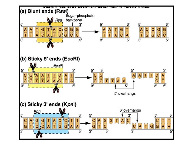 Restriction Endonucleases: Type II Cohesive Ends Blunt Ends (3´ Overhang) (No Overhang) Bam. H 1 Kpn. I Hae. III GGATCC CCTAGG GGTACC CCATGG GGCC CCGG (5´ Overhang)