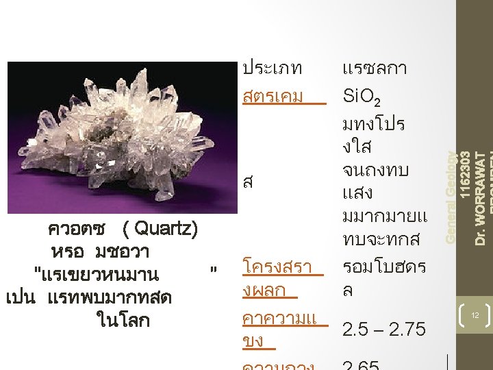 General Geology 1162303 Dr. WORRAWAT Silicon dioxide )Si. O 2) = ทราย = Quartz Colorless quartz 42