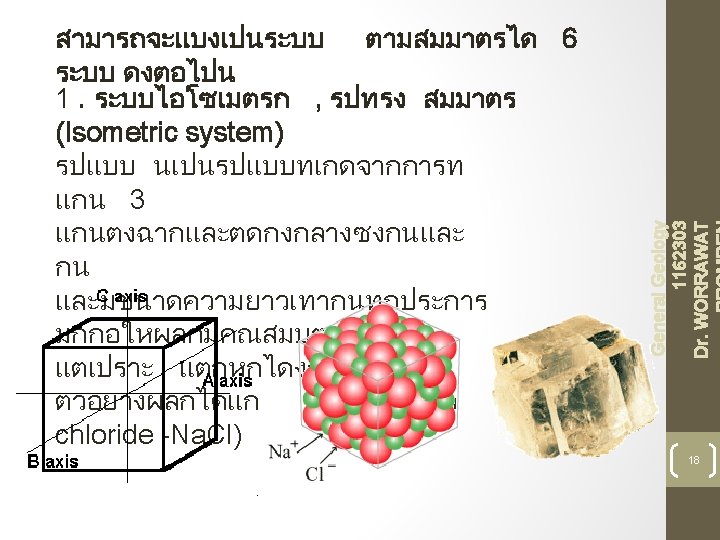 General Geology 1162303 Dr. WORRAWAT Halite (Na. Cl) แนกวแตก 3 ทศทาง ตงฉากกน 37