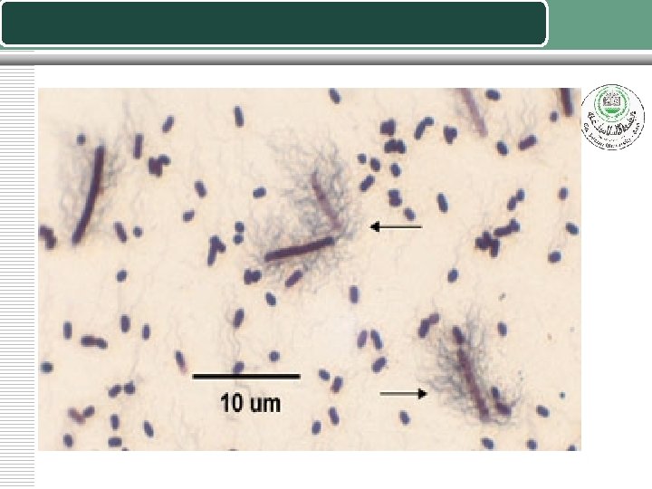 Flagellar stain v Flagella are too thin to be seen by the ordinary light microscope. v Flagella should be amplified (enlarged). Use a stain that is specifically deposited on Flagella thus increasing diameter. v Some flagellar stains employ rosaniline dyes and a mordant, applied to a bacterial suspension fixed in formalin and spread across a glass slide. The formalin links to, or “fixes, ” the flagellar and other surface protein of the cells. The dye and mordant then precipitate around these “fixed” surfaces, enlarging their diameters, and making flagella visible when viewed under the microscope. v Another method, a ferric-tannate mordant and a silver nitrate solution are applied to a bacterial suspension. The resulting dark precipitate that forms on the bacteria and their flagella allows them to be easily visualized under the microscope. This silver-plating technique is also used to stain the very slender spirochetes. v The techniques are somewhat sensitive.