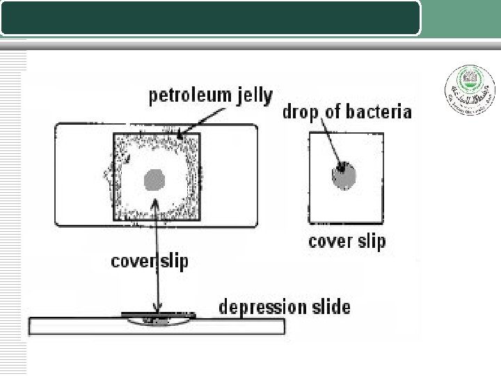 Hanging Drop technique 1. Place a drop of the bacterial culture (optimally from a young broth culture) in the middle of a cover slip. 2. Place a thin line of petroleum jelly around the edge of the cover slide. 3. Turn the depression slide upside-down (depressed area facing down) and gently touch the cover slide. The jelly holds the cover slip to the slide and also keeps the suspension from drying out. 4. Now flip the entire microscope slide/cover slip combination over. It should look like the diagram below