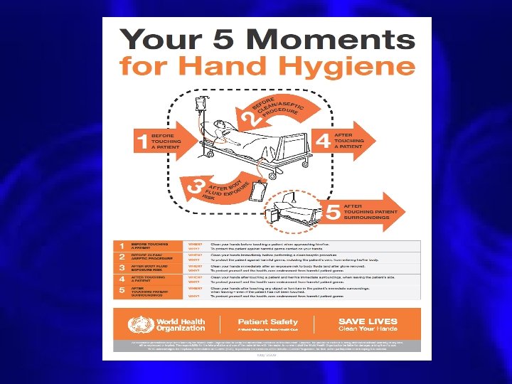 WHO Hand Hygiene Guidelines • Why? – Healthcare acquired infections account for 99, 000 deaths per year in the USA – Hands are the main transmission vehicle – Hand hygiene is, therefore THE most important measure to prevent infections