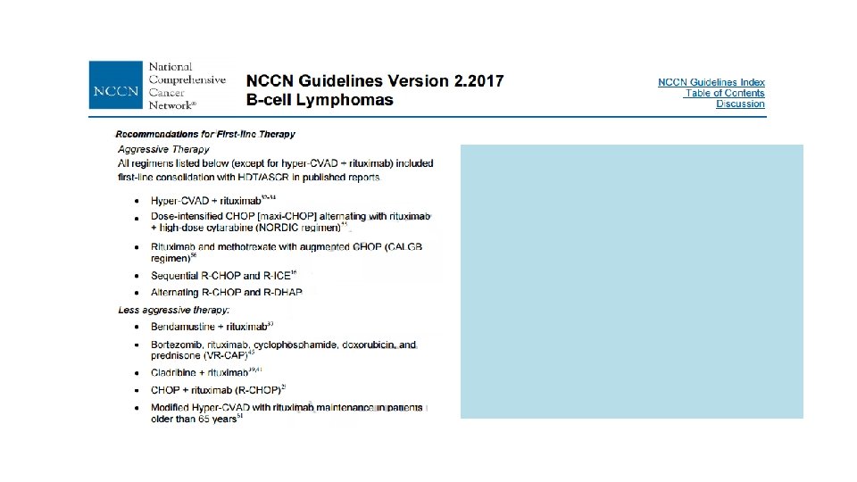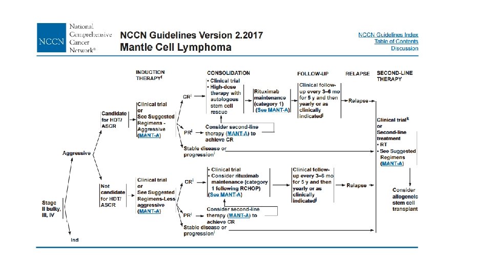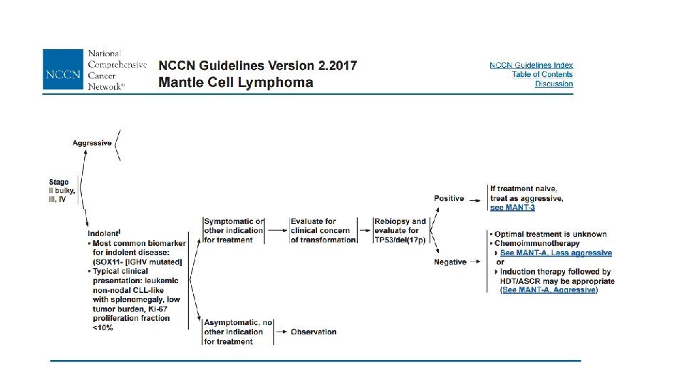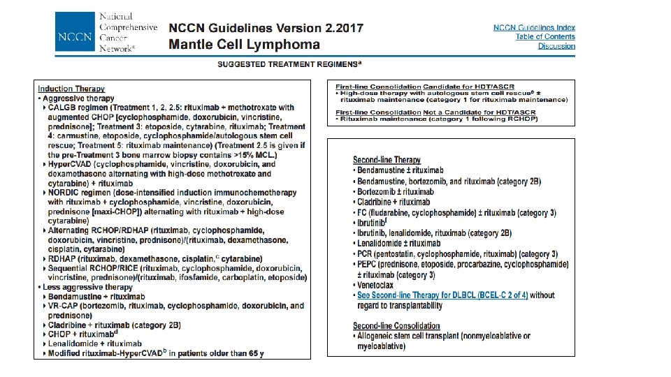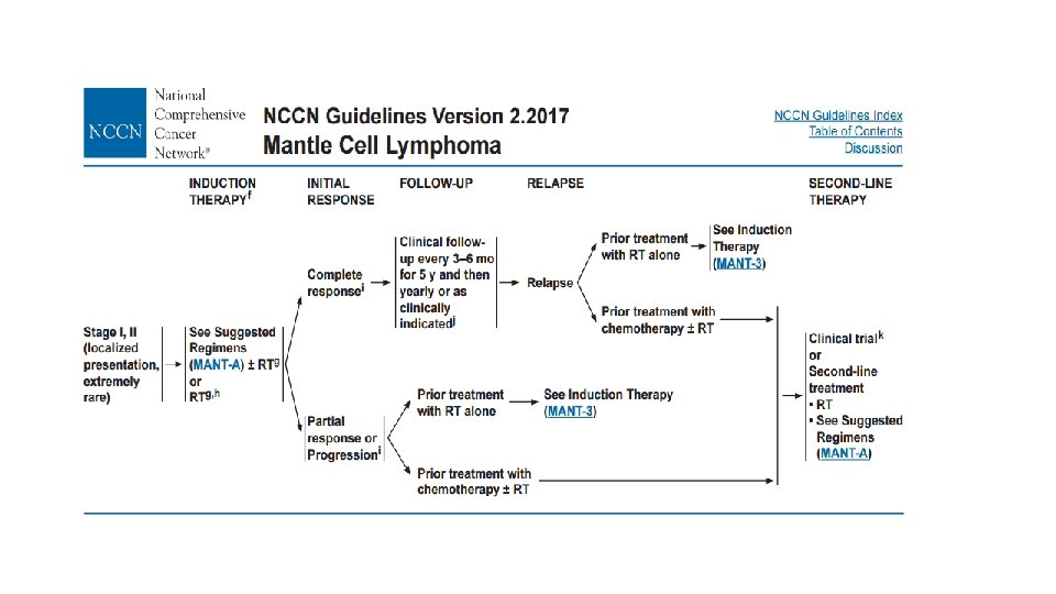 MCL: Clinical Features q > 90% stage III/IV, including marrow involvement q Blood (lymphocytosis), and lymphadenopathy (75 -90 %) q Extranodal sites common a) GI (upper and lower, can present as lymphomatous polyposis coli), (25 %) b) CNS involvement rare (<5%) c) Leukemic phase, PB flow commonly positive Most patients present with advanced stage disease. . Cheah CY, et al. Ann Oncol. 2013; 24: 2119 -2123