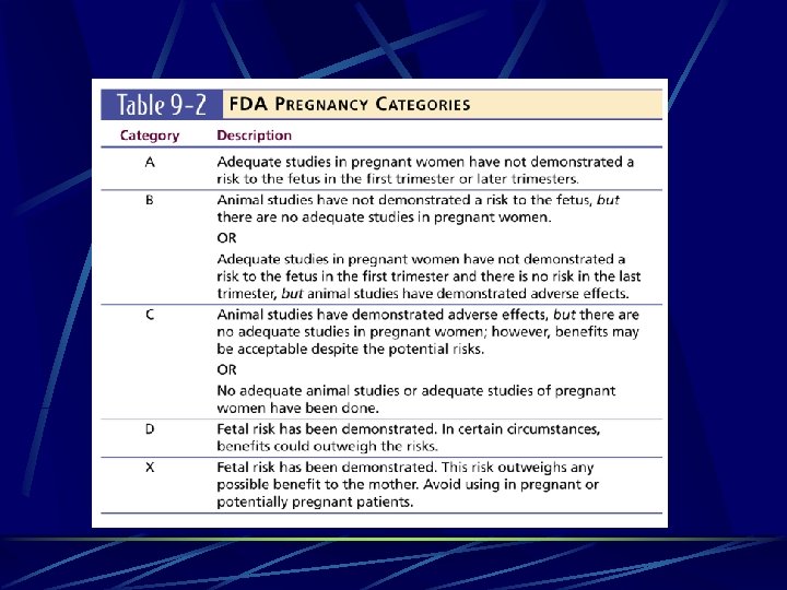 Special Considerations Pregnant patients l l l Before using any drug during pregnancy, the expected benefits should be considered against the possible risks to the fetus The FDA has established a scale (Categories A, B, C, D, and X) to indicate drugs that may have documented problems in animals and/or humans during pregnancy Many drugs are unknown to cause problems in animals and/or human during pregnancy