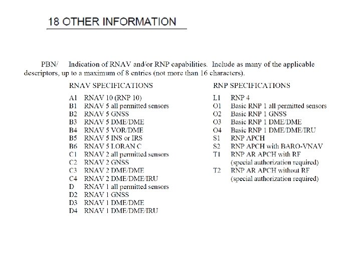 • The sequence that indicators should appear in is compulsory • Any given indicator can only appear ONCE in Field 18 • Hyphen (-) and slash (/) characters forbidden in data • STS/ indicator is not a free-text field • Search and Rescue = STS/SAR • PBN/ is now mandatory to detail Performance based navigation equipment capabilities • NAV/ entry is required when GPS equipment is specified