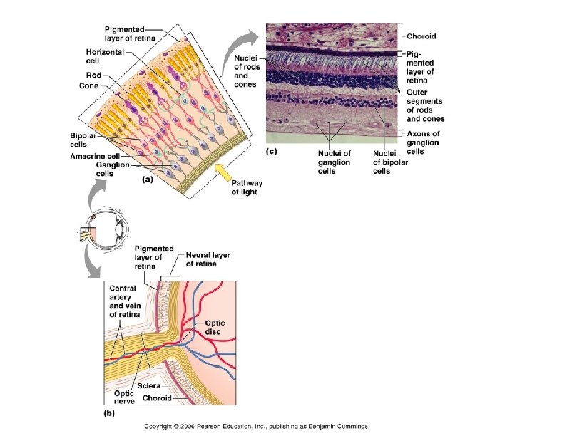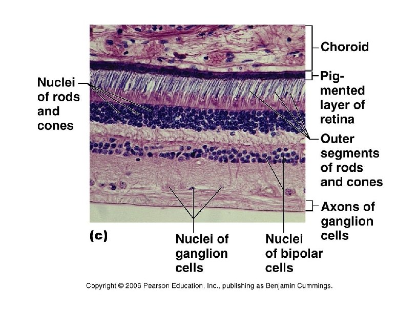 Synaptic terminals Rod cell body Inner fibers Rod cell body Cone cell body (a) Human Anatomy and Physiology, 7 e by Elaine Marieb & Katja Hoehn Nuclei Mitochondria Retinal Outer segment Inner segment Pigmented layer Outer fiber Light Li gh t Process of bipolar cell Light Photoreceptors of the retina (b) Opsin Connecting cilia Apical microvillus Discs being phagocytized Discs containing visual pigments Melanin granules Pigment cell nucleus Basal lamina (border with choroid) Copyright © 2007 Pearson Education, Inc. , publishing as Benjamin Cummings.