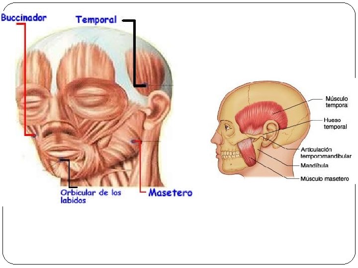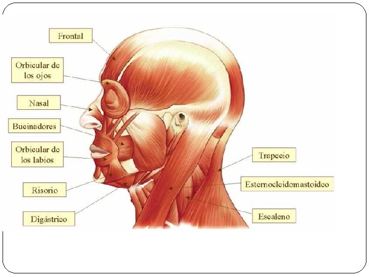1. Frontal 7. Masetero 2. Temporal 8. Bucinador 3. Procero 9. Digástrico 4. Orbiculares del ojo 10. Mentoniano 5. Zigomáticos 11. Platismo 6. Orbiculares de la boca