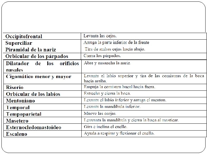Músculos de la cabeza y del cuello. �La mayoría de los músculos del cráneo y de la cara son del tipo cutáneo, es decir, se insertan directamente en la piel, son músculos planos, delgados y de escasa potencia. � En la especie humana cobra una gran importancia el poder reflejar el estado de ánimo interno por medio de una serie de gestos en las diversas zonas de la cara. Este hecho tiene una finalidad que las personas que nos rodean puedan saber en cada momento cual es nuestro estado de ánimo.