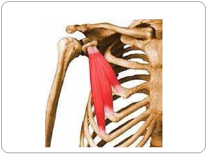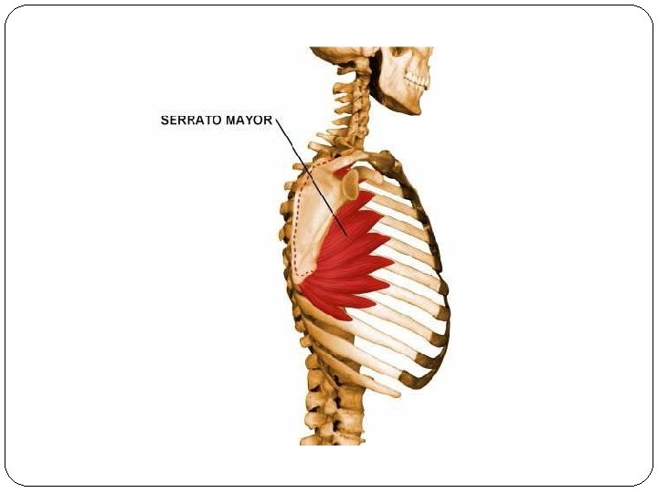 �Músculo serrato mayor. Une las nueve primeras costillas con la escápula, desempeña principalmente dos acciones, la respiratoria y el movimiento de la escápula.