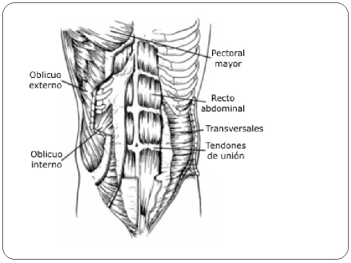 Músculos del abdomen. � Los músculos que forman la pared abdominal son cuatro. 3 son de tipo ancho, mientras que el cuarto es de tipo largo y que dispone de varias interposiciones tendinosas transversales a lo largo de su recorrido. � Músculos anchos, formado por Oblicuo mayor, Oblicuo menor y Transverso. Todos ellos cuando se contraen provocan una constricción abdominal y contribuyen de esta forma como músculos respiratorios. También actúan produciendo la flexión y la rotación de la pelvis. Tienen gran importancia en momentos donde aumenta la presión intraabdominal como en el parto o durante el acto de la defecación