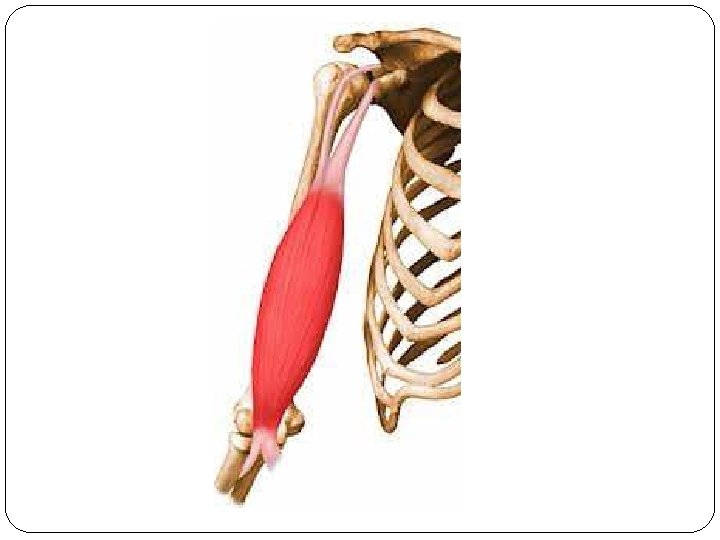 �Músculo bíceps. Es un músculo alargado, su parte superior está dividida en dos porciones diferentes que se insertan en la escápula. El extremo inferior lo forma un resistente tendón, se inserta en una protuberancia del radio. Su acción consiste en la flexión del antebrazo.